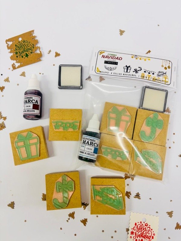 Incluye: 4 sellitos de 4cm + 1 tinta de 20ml + 1 almohadillita de 4cm